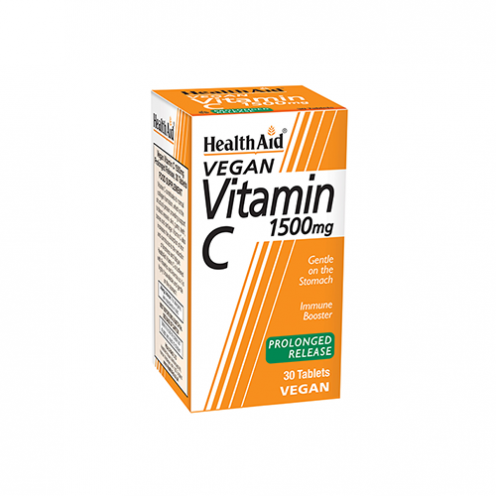 Η Βιταμίνη C 1500mg της HealthAid είναι ρυθμισμένης οξύτητας (buffered) με καρπό αγριοτριανταφυλλιάς και ασερόλα, ρουτίνη και εσπεριδίνη. Η ταμπλέτα είναι βραδείας αποδέσμευσης, απελευθερώνοντας σταδιακά μικρές ποσότητες βιταμίνης C.