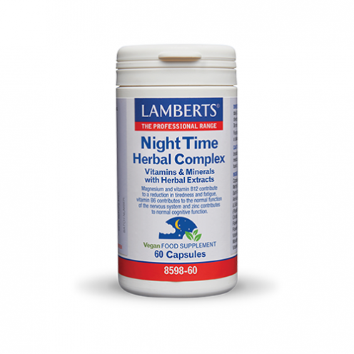 Το Night Time Herbal Complex αποτελεί μια ειδικά σχεδιασμένη φόρμουλα κλινικής διατροφής των 2 καψουλών ημερησίως για άτομα που δυσκολεύονται να κοιμηθούν ή να διατηρήσουν τον ύπνο τους. Περιέχει L-τρυπτοφάνη, βιταμίνες του συμπλέγματος Β, μαγνήσιο, ψευδάργυρο και τιτλοδοτημένα εκχυλίσματα λυκίσκου, πασιφλόρας, μελισσόχορτου και χαμομηλιού.