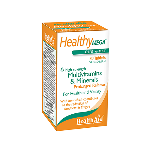 Το Healthy Mega της HealthAid περιέχει 41 διατροφικά στοιχεία, μεταξύ των οποίων βιταμίνες, μέταλλα, ιχνοστοιχεία και πεπτικά ένζυμα, τα οποία δρουν συνεργικά, σε ταμπλέτες βραδείας αποδέσμευσης για κάλυψη του οργανισμού όλο το 24ωρο.