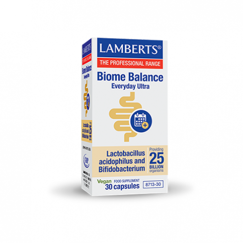 To Biome Balance Everyday Ultra της Lamberts® αποτελεί ένα σκεύασμα χωρίς προσθήκη γάλακτος, που περιέχει 25 δισεκατομμύρια βακτήρια ανά κάψουλα (κατά τη στιγμή της παρασκευής), καθιστώντας ως το υψηλότερης ισχύος σκεύασμα φιλικών βακτηρίων της εταιρείας μας.